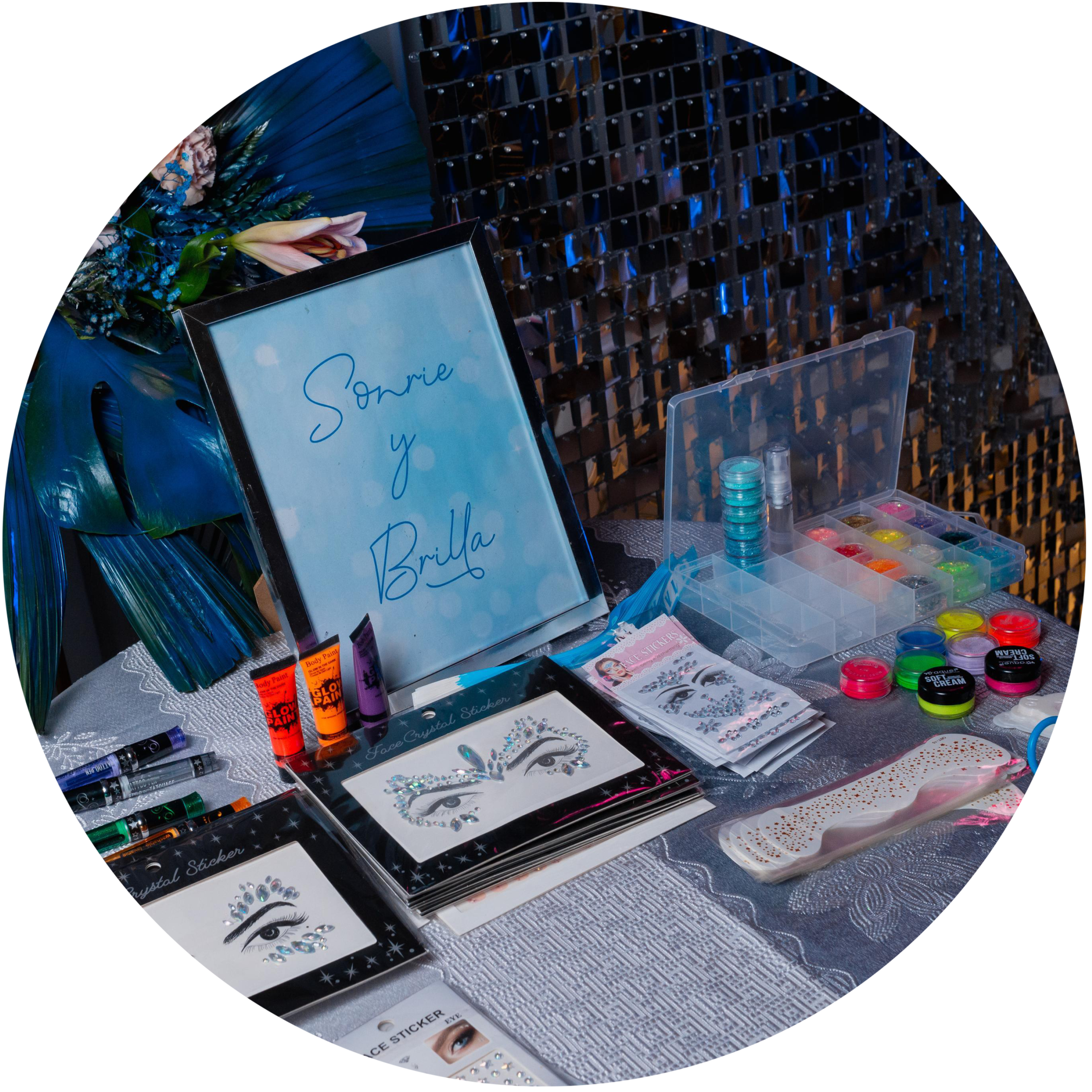 Luz , brillo y expresión. Maquillaje con Glitter, gemas, tatuajes temporales y estilo para que tus invitados brillen toda la noche.